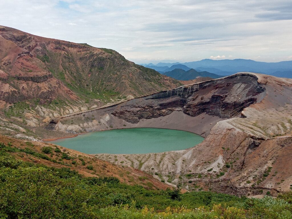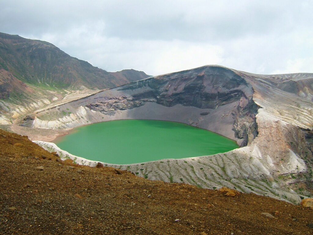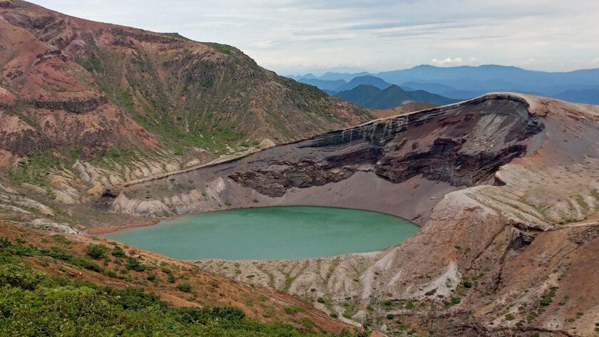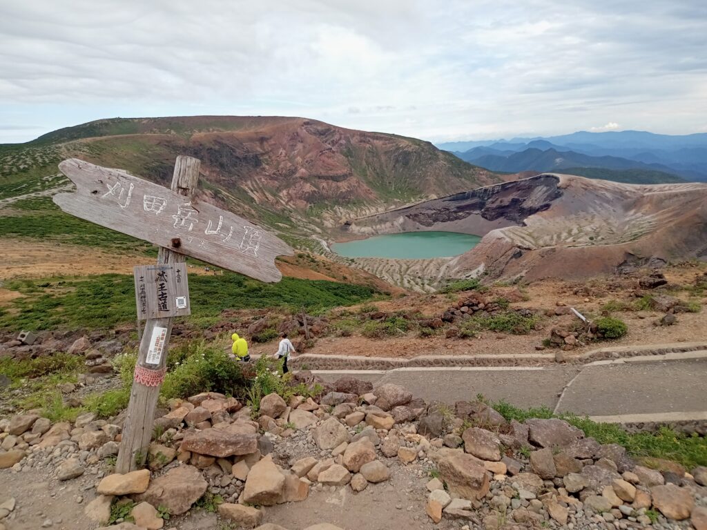 そして、有料の蔵王ハイラインを上って蔵王山頂を目指します。駐車場からすぐのところで、蔵王の御釜を眺めることができます。この火口湖は、周囲約1kmで気候や時間によって湖面の色が変わることから五色沼とも言われています。