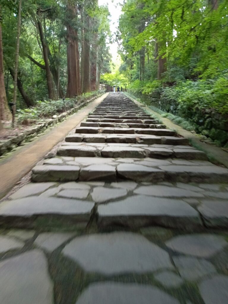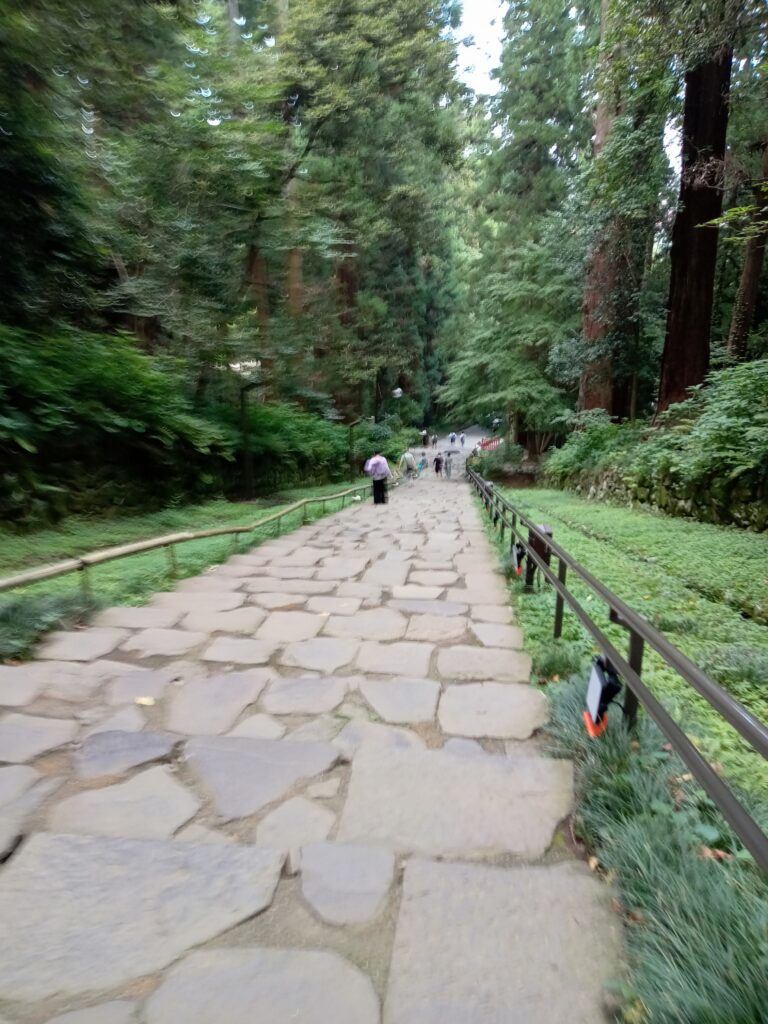 石造りの階段は、藩政時代からのもので戦災を免れたものです。左右にそびえる杉並木も立派ですね。