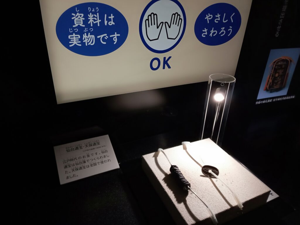 お腹を満たしてから向かったのは近くにある仙台市博物館。ここでは、仙台伊達家からの寄贈資料をはじめ、仙台に関わる歴史・文化・美術工芸品などを見ることができます。約10万点の収蔵資料の中から季節ごとに展示替えを行っているそうです。また、展示する資料のほとんどが実物で、触ることができるコーナーもありました。特別展もやっていましたが、常設展だけの見学にしました。