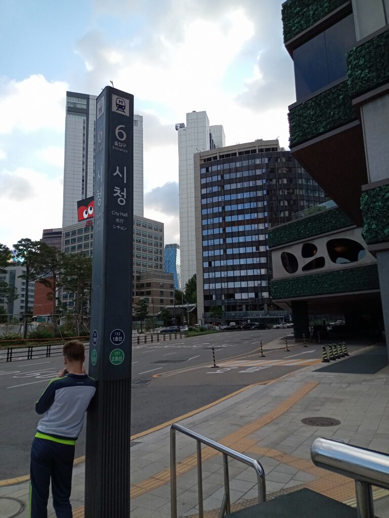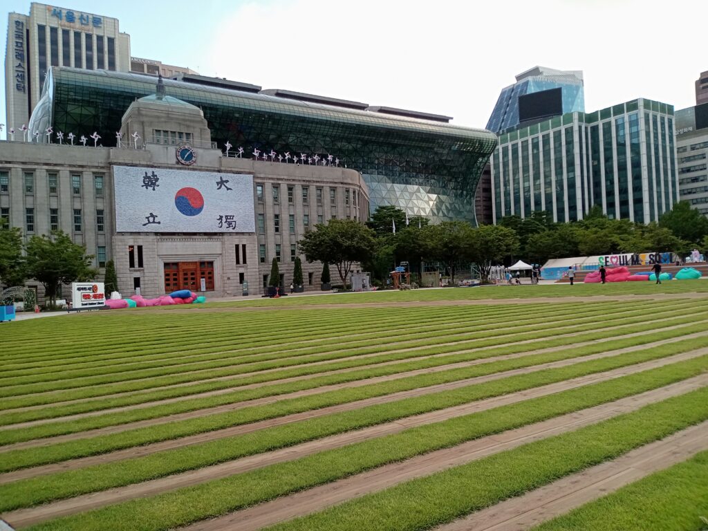 ツアーは7:35に、地下鉄市長駅(City Hall駅)の6番出口に集合とのこと。宿泊していた場所からは地下鉄一駅分なので、歩いて向かいました。集合場所の向かいには、ソウル広場があり、ソウル図書館と支庁がありました。