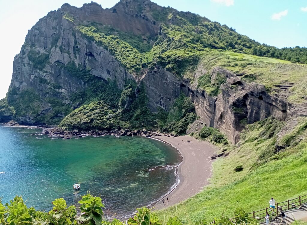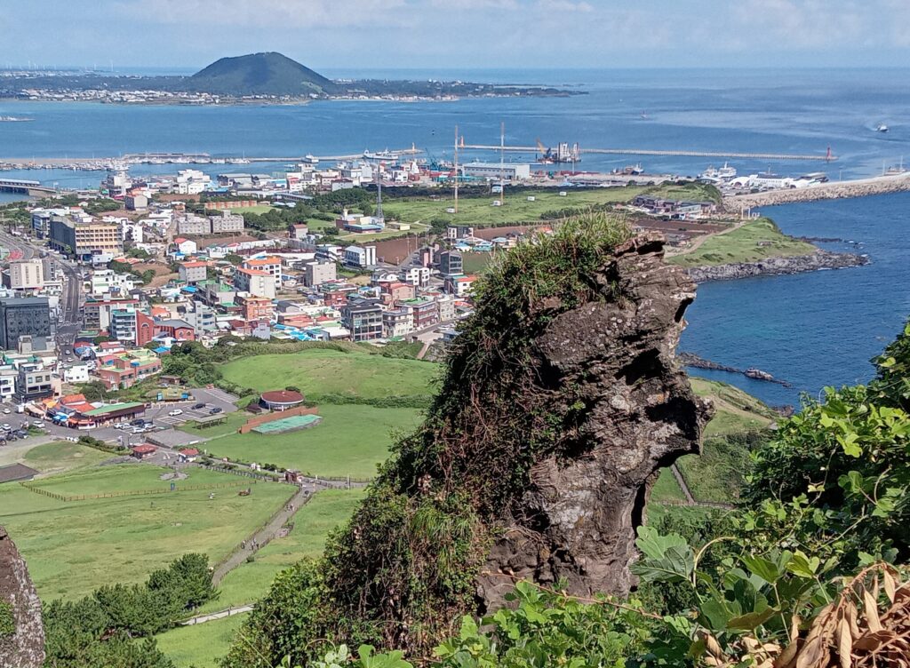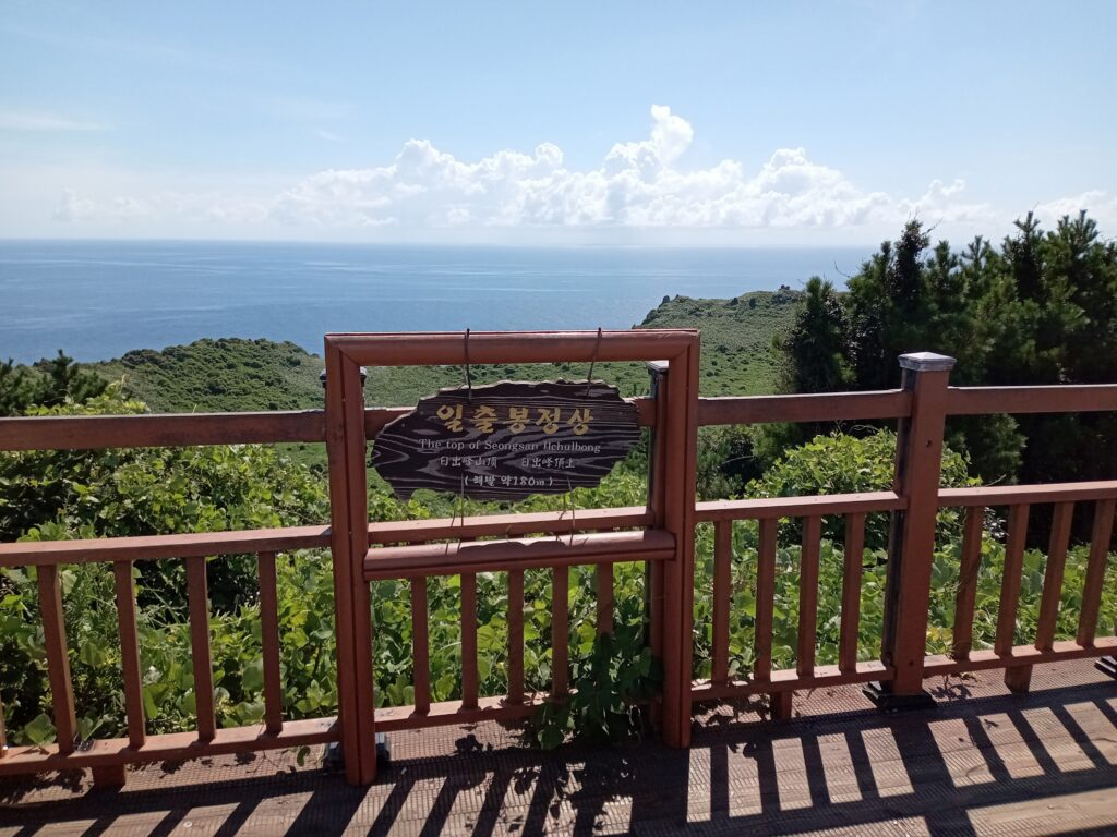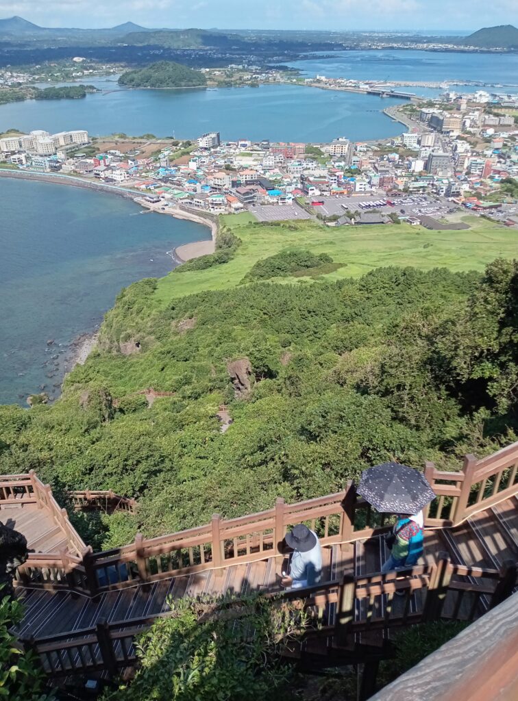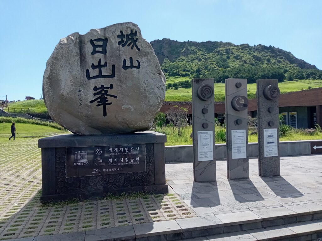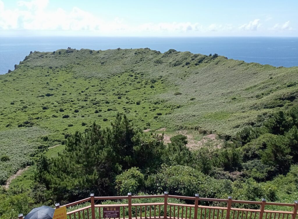 ホテルまで迎えに来てもらい、まず向かったのは城山日出峰。ここは、済州島の最東端に突き出るようにたたずむ平たい山で、世界遺産に登録されています。