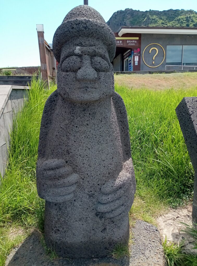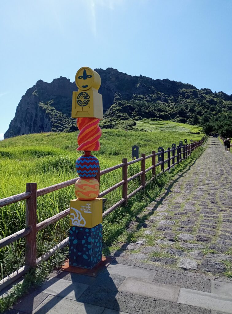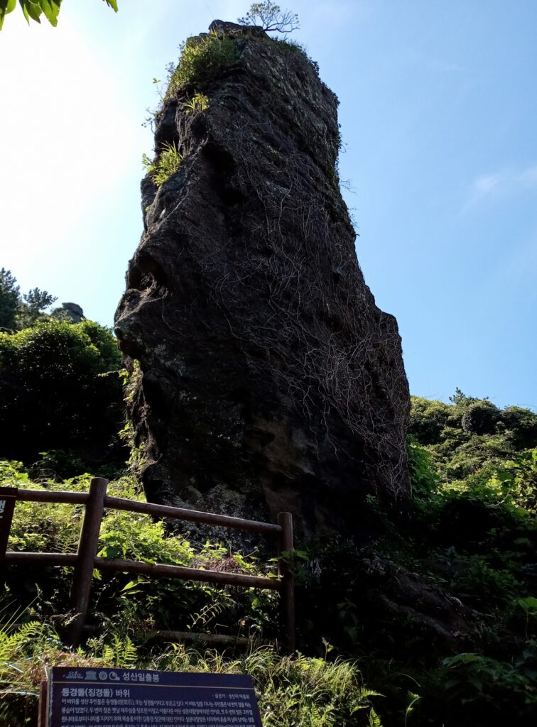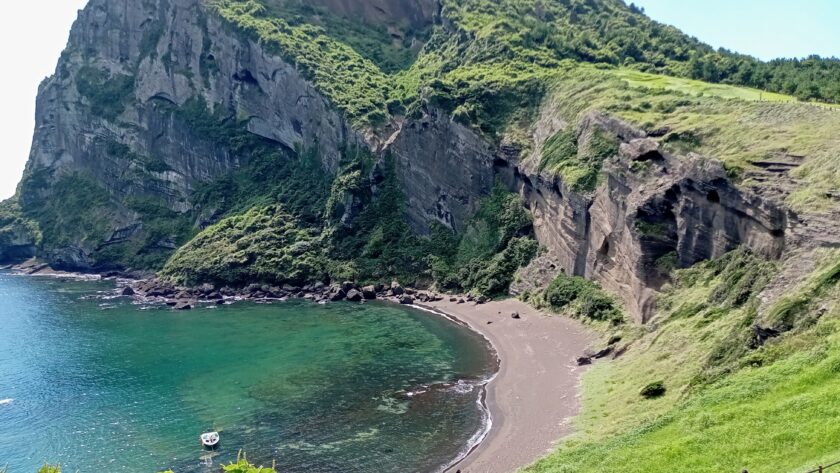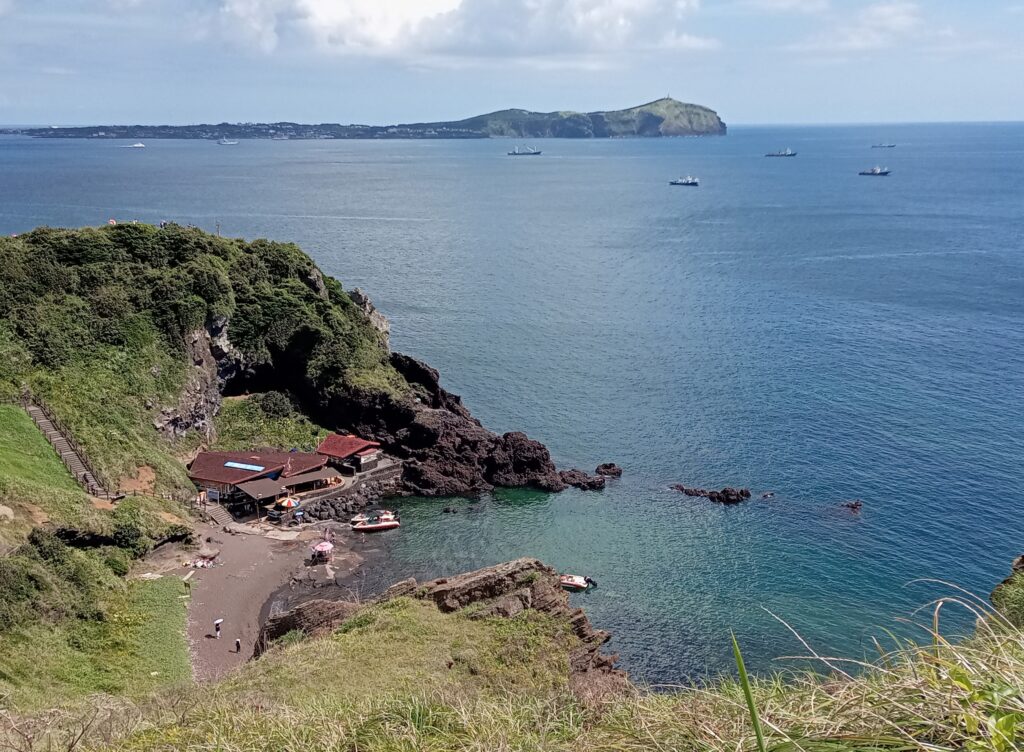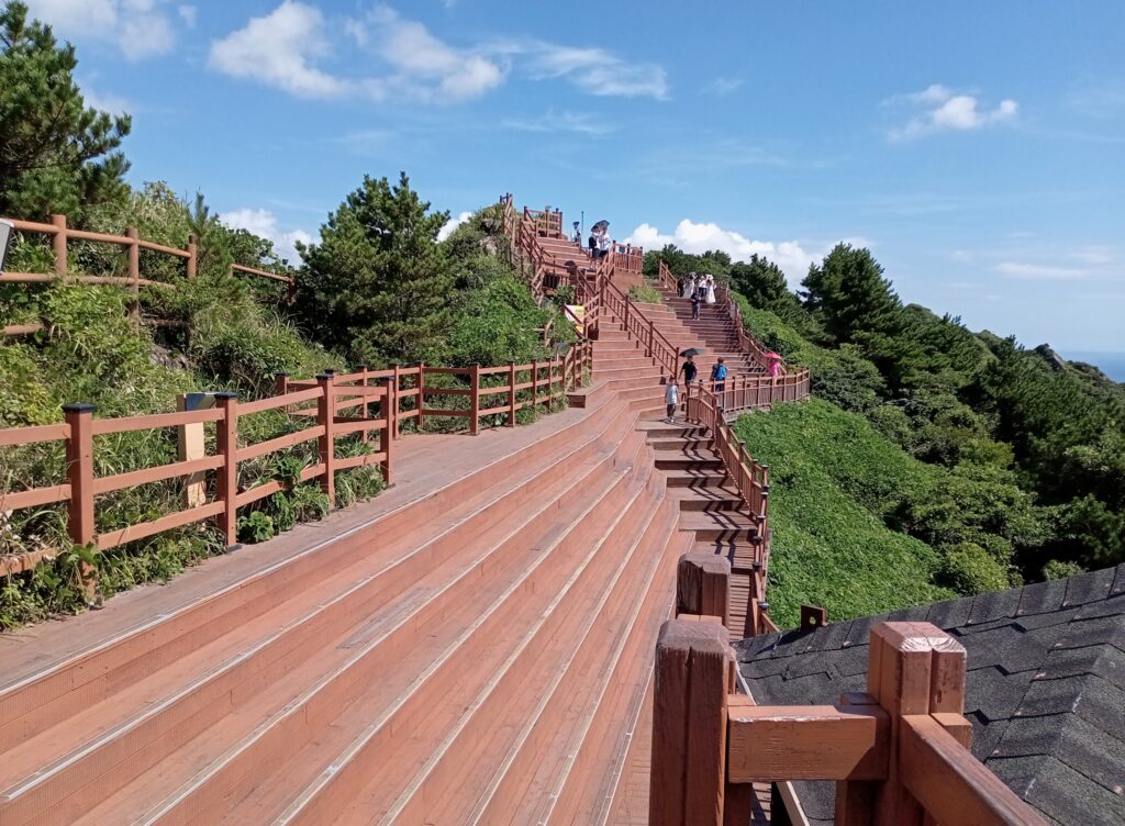 ホテルまで迎えに来てもらい、まず向かったのは城山日出峰。ここは、済州島の最東端に突き出るようにたたずむ平たい山で、世界遺産に登録されています。