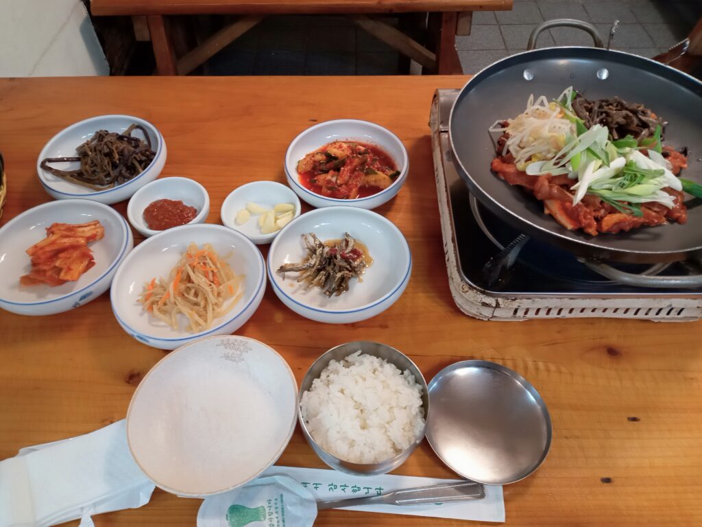 民俗村を見学した後は昼食です。済州の美味しい食べ物のひとつである黒豚。コチュジャンソースで味付けた黒豚焼きを堪能させてもらいました。