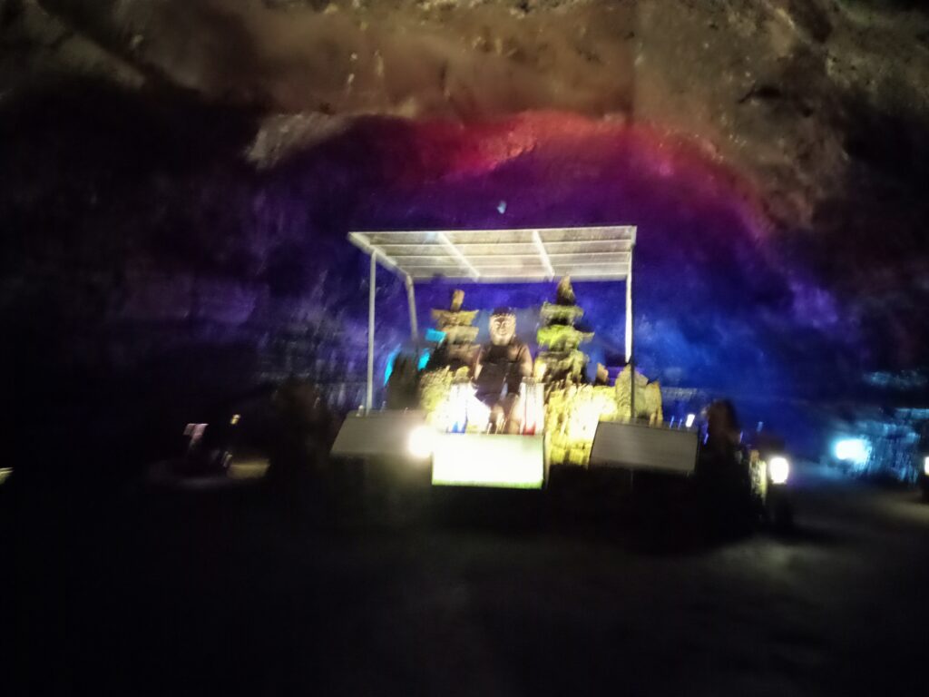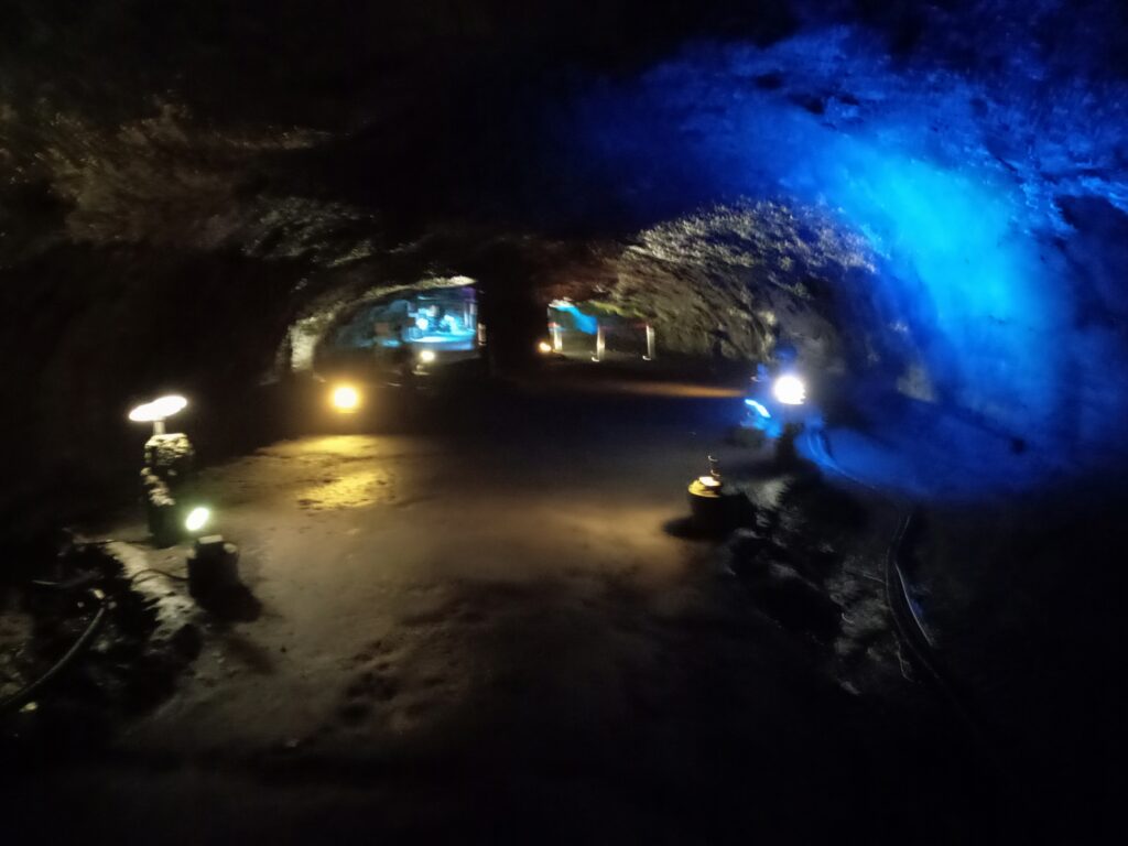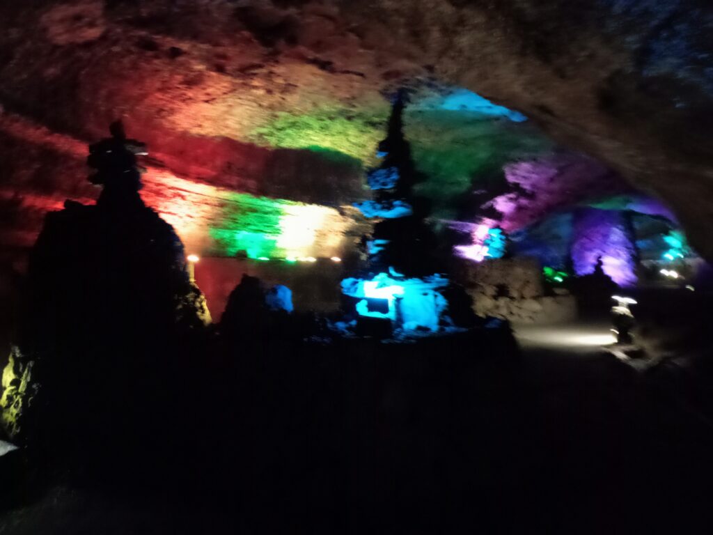 洞窟の入口にはひんやりとした空気が流れてきます。真夏の暑さの中回っていたので、非常に心地よかったです。中は、長い年月をかけて形成された鍾乳石や石筍、石柱などが点在する自然洞窟で、足元も整備されていて歩きやすくなっていました。(※写真がだいぶぶれています……)