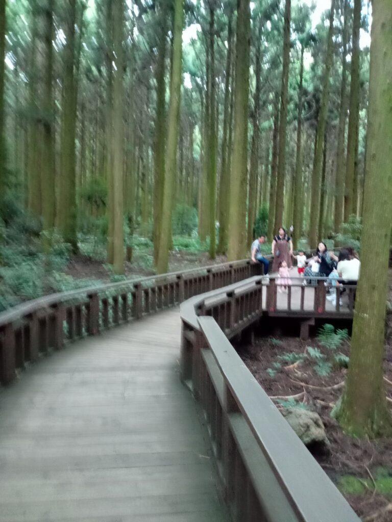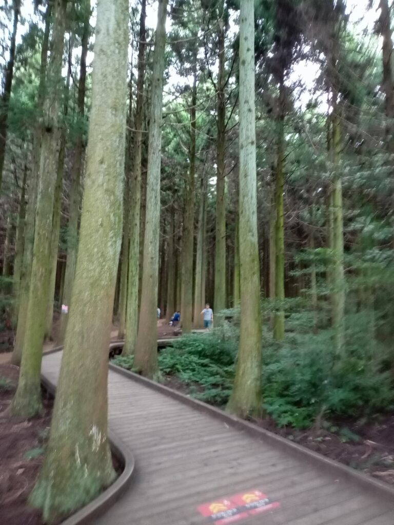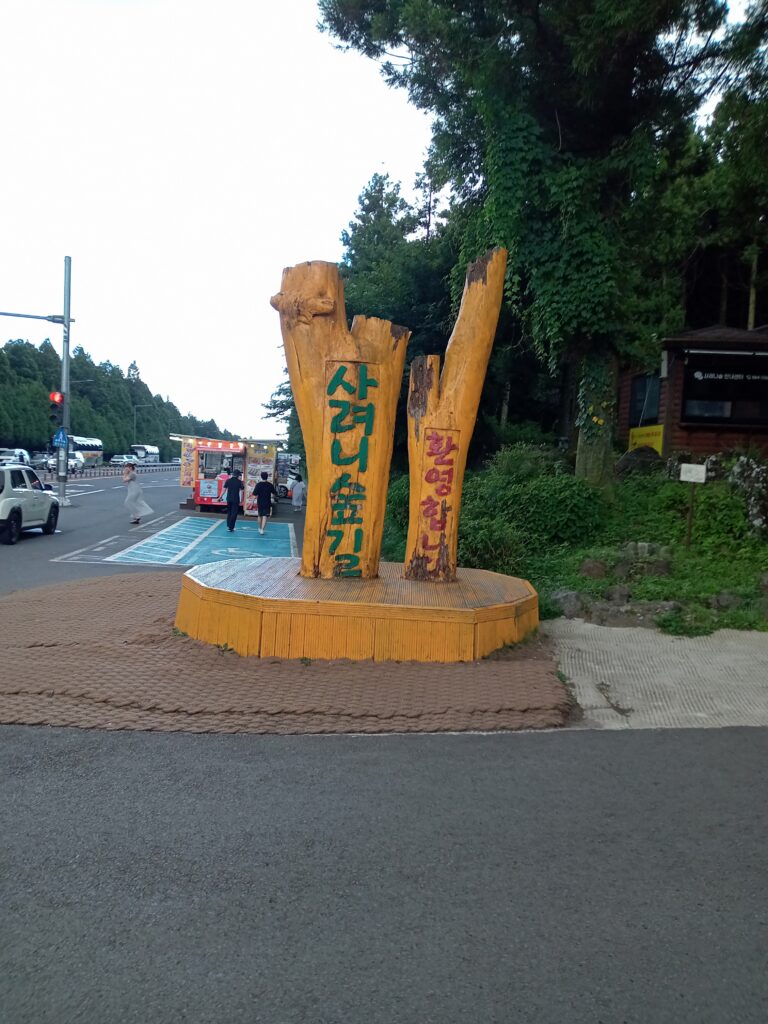ツアー名には漢拏山(ハルラサン)登山とありますが、登山はせずにサリョニ林道に向かいました。ここは、「済州隠れ秘景31」の1つとして、韓国で最も美しい道路に選ばれた場所です。スギの木が生い茂る森を散策しながら、マイナスイオンを浴びて、疲れを癒します。遊歩道がしっかり整備され、座ったり、寝たりするところなどがあり、長時間くつろぐことができる場所ともなっていました。