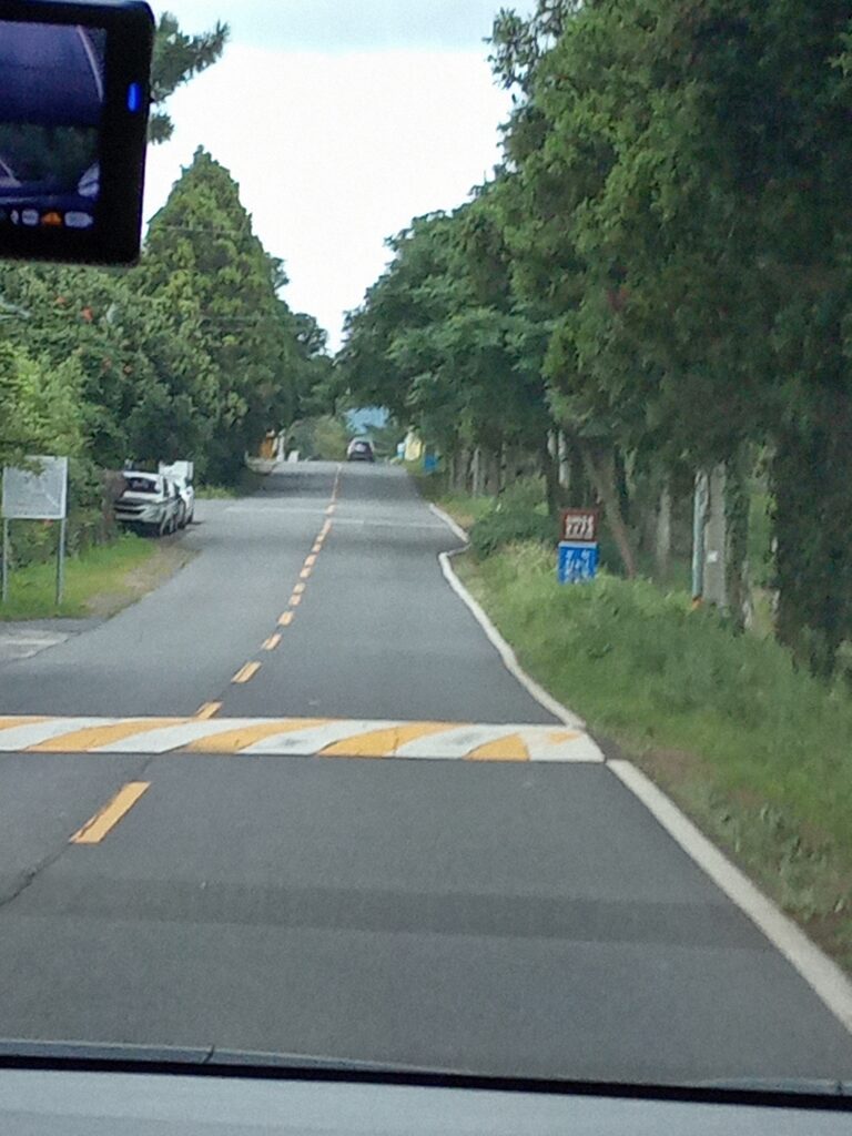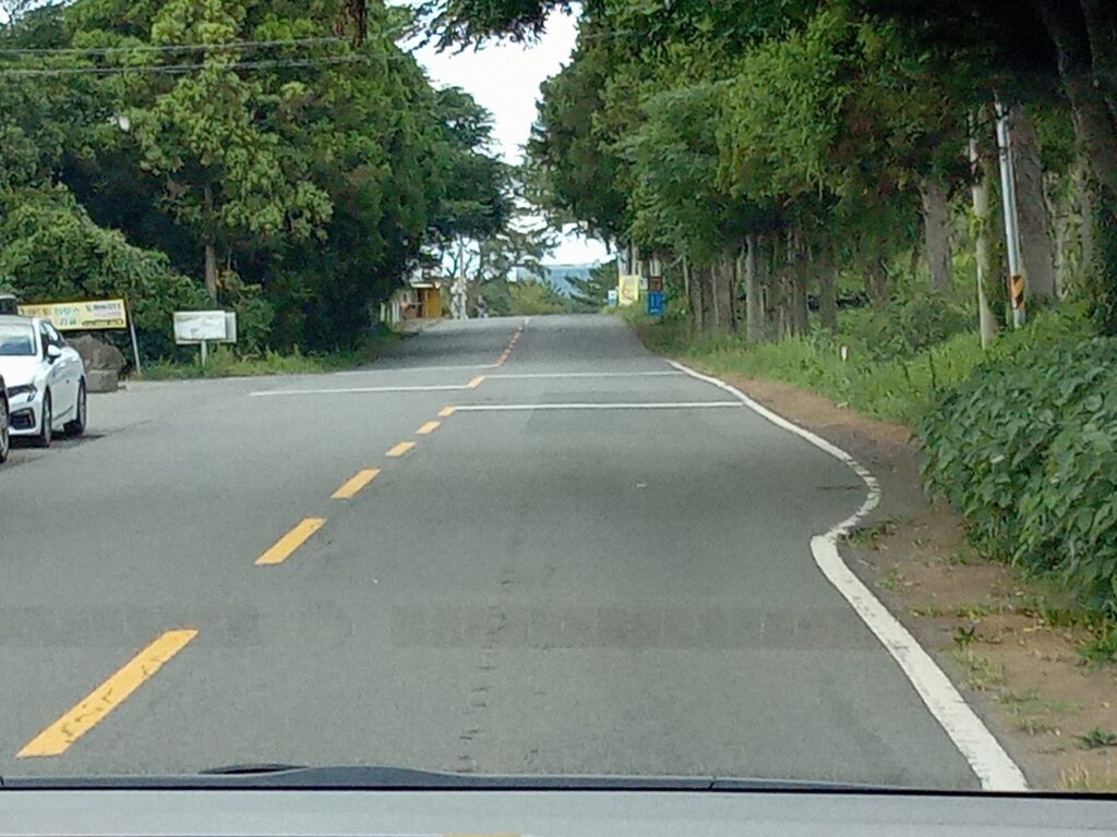 ホテルに戻る途中、最後に向かったのはお化け道です。どう見ても上り坂なのに、車が自然と下っていく道です。車内から撮った写真ですが、登り坂に見えると思いますが、なにもしなくてもどんどん下っていきます。