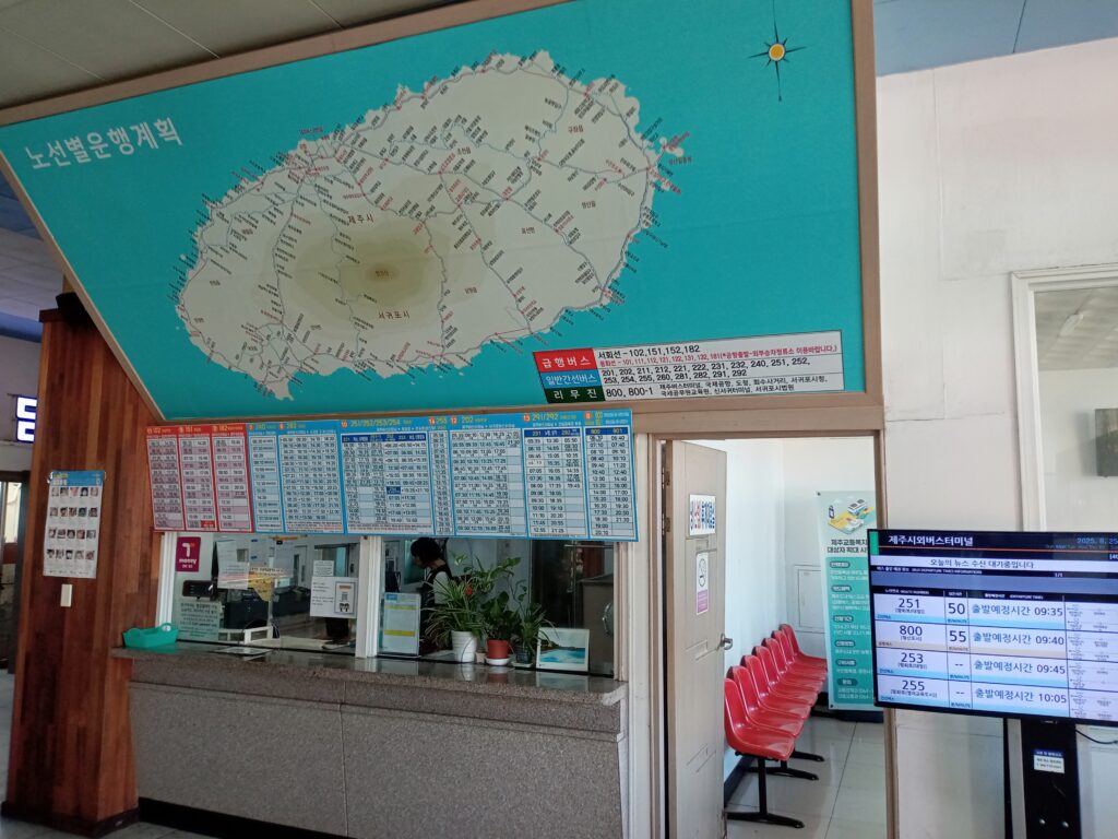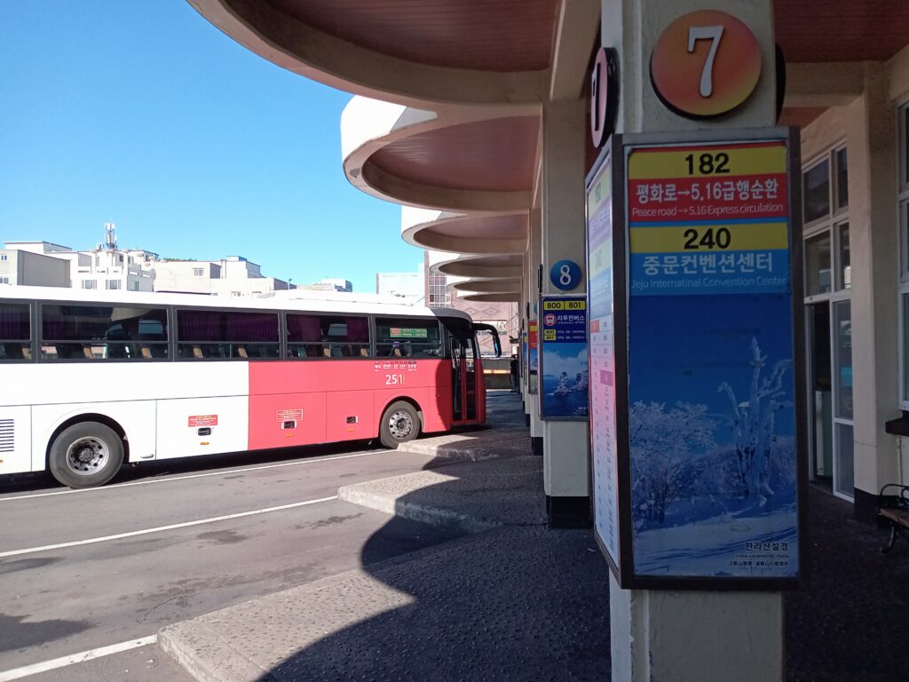 まずは、ホテルから済州バスターミナルへ向かい、最初の滝の辺りに行く、中文観光団地方面のバスがどれか聞きます。そして、お目当てのバスに乗ろうとしましたが、心配だったので一応運転手さんにも聞いたところ、隣に来ているバスの方がいいよとのこと!?言われた通り、となりのバスに乗り、Google mapでどこを通っているか確認しながら、目的地へと向かいます。