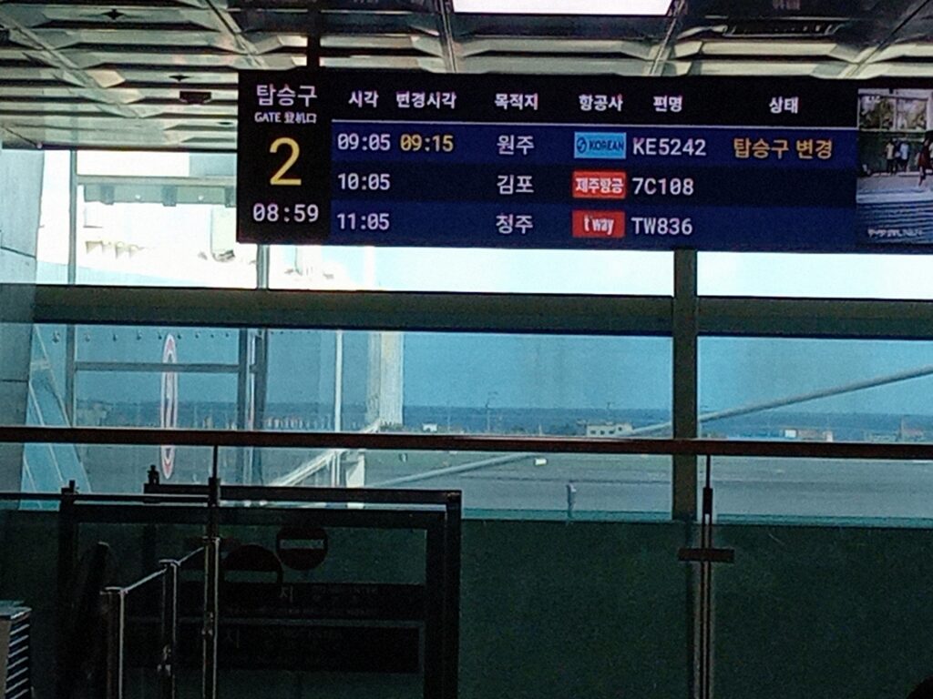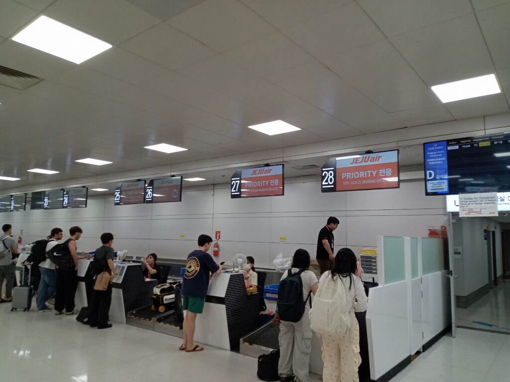 まずは、ホテルをチェックアウトし、Uberで手配した車で空港へと向かいました。済州島からソウルへも行きと同様、チェジュ航空を利用します。空港のコンビニで遅めの朝食を購入し、食べながら搭乗口付近で待ちます。