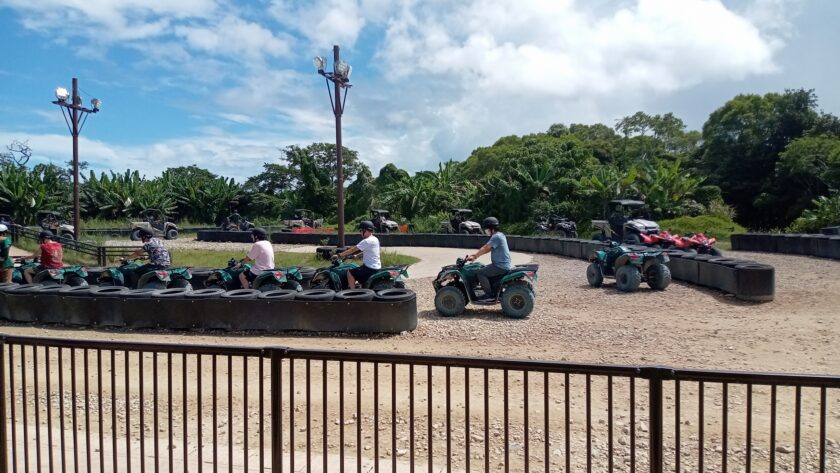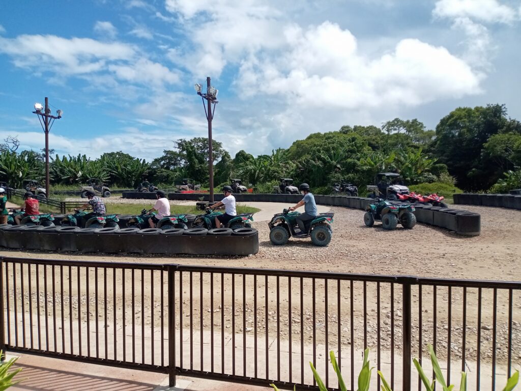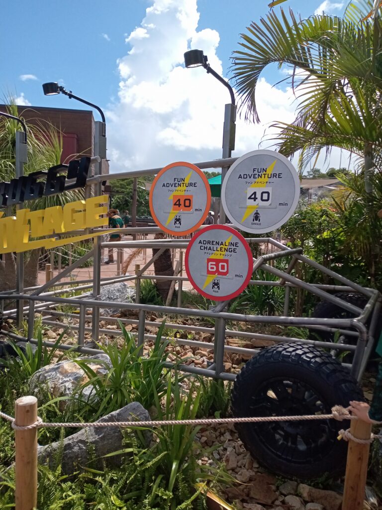 整理券を取得して、まず向かったのは、BUGGY VOLTAGE(バギーボルテージ)。ここは、バギーでコースを駆け抜けるアトラクションです。ファンアドベンチャーコース(1人乗り・2人乗り)とアドレナリンチャレンジコース(2人乗り※1人乗車も可)の2つありますが、コースが長く、起伏も大きいアドレナリンチャレンジコースがおもしろそうと思い、体験同意を提示して列に並びます。