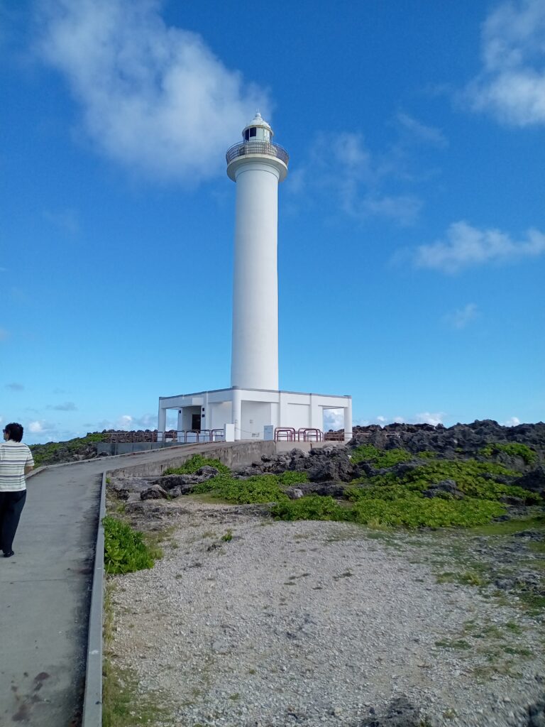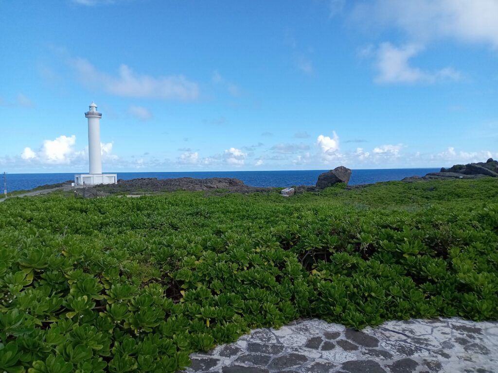 名護から45分ほどかけて向かったのは、残波岬。隆起した珊瑚礁の断崖が続く岬です。岬の先には灯台が立っています。灯台からは海を一望できるようですが、ここも開く前だったので中に入ることはできませんでした。