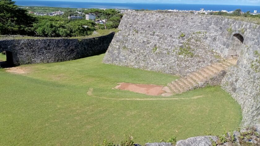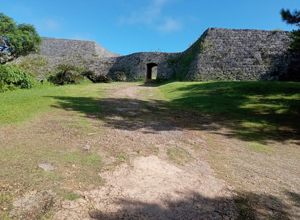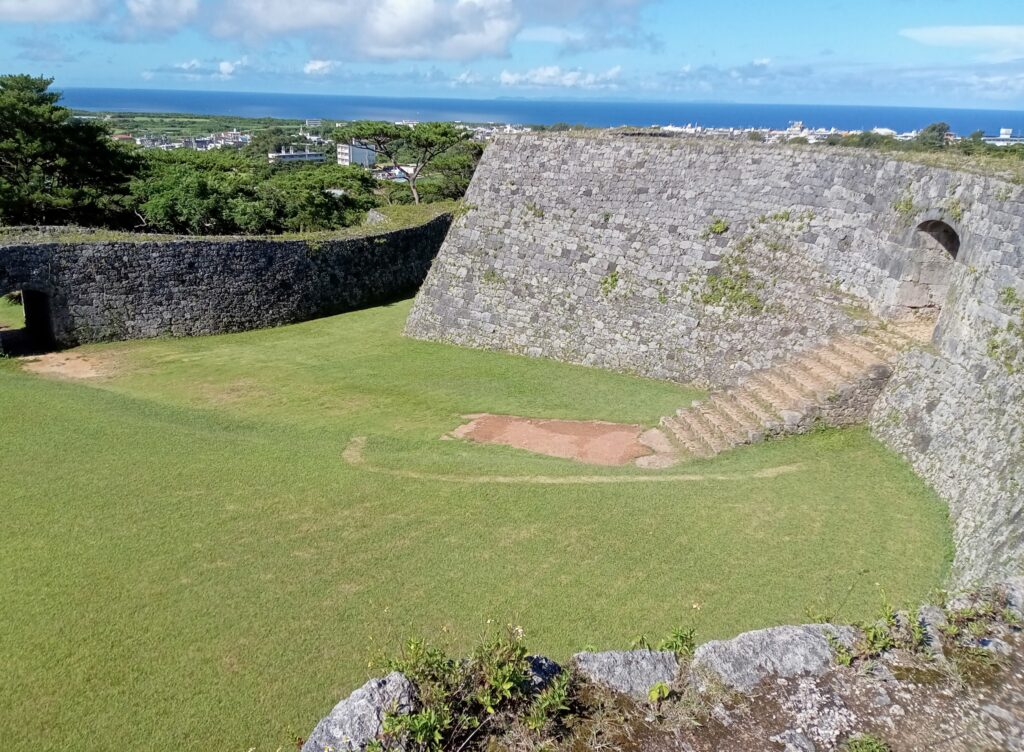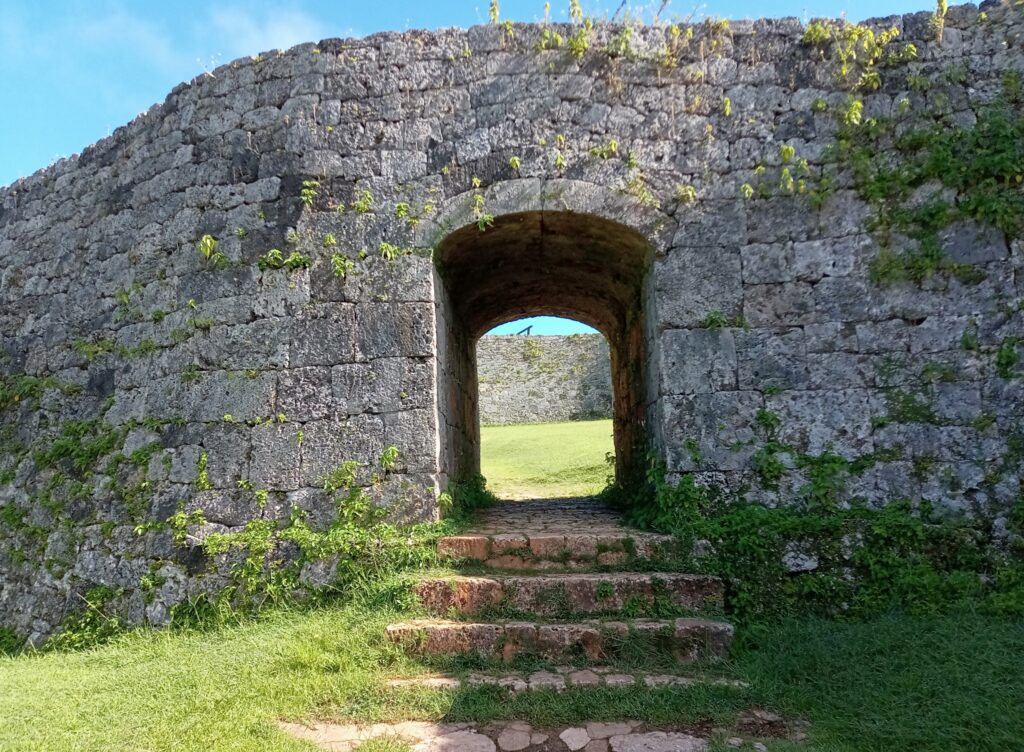 続いては残波岬からも近い、座喜味城跡へ。護佐丸によって15世紀初頭に築城されたグスク跡です。沖縄最古のアーチ門があり、世界遺産にも登録されています。城壁からは石積み建築の美しさを感じることができ、あわせて東シナ海を一望することもできます。