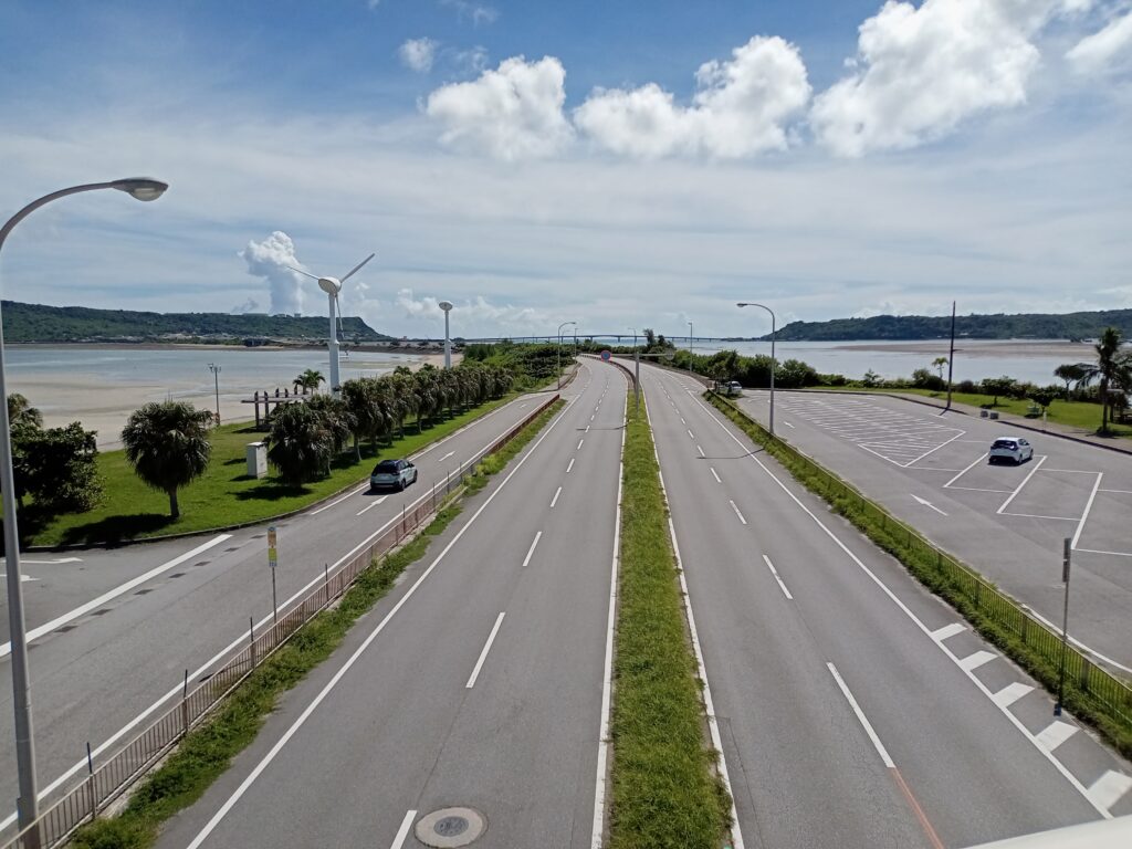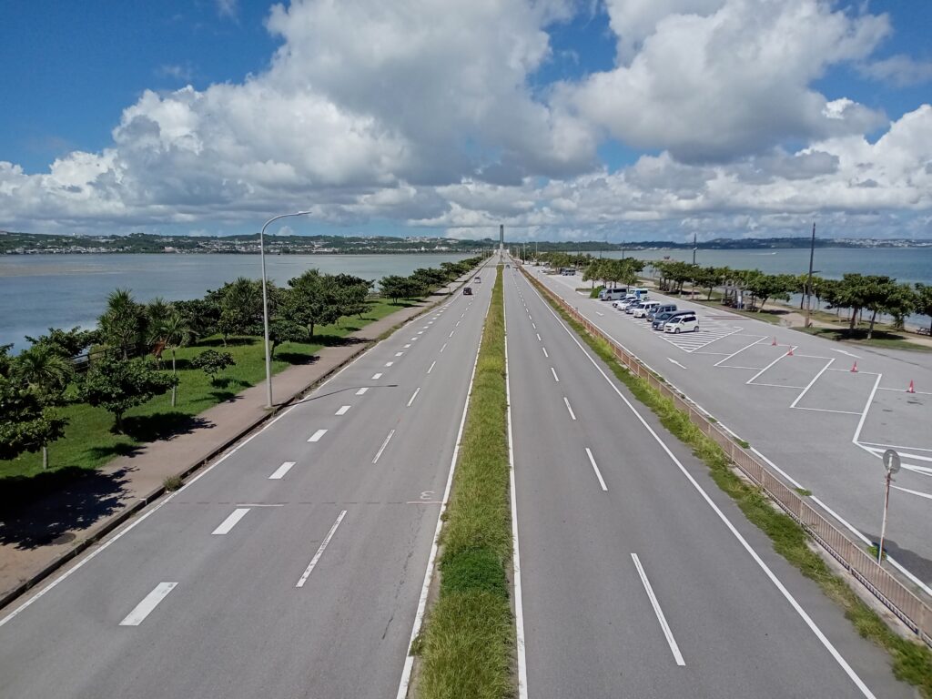 次は、果報バンタのある宮城島を目指し、東側に向かって車を走らせます。その途中、本島と平安座島を結ぶ海中道路を通ります。両サイドにはきれいな海が広がり、素晴らしいドライブコースです。中間地点にはロードパークがあり、休憩することができます。