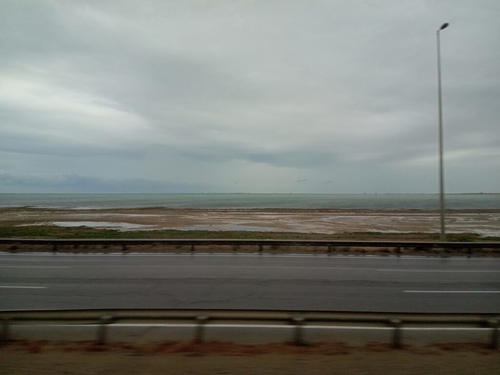 バクー市内のレストランで昼食をとった後は、郊外のゴブスタンへと向かいます。道中、左側には大きな湖が見えます。世界一の大きさを誇るカスピ海です。ただ車窓からの眺めでは、大きさはあまりわかりませんでした。
