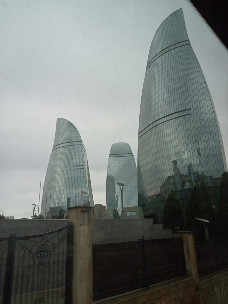 ゴブスタンを後にしたら、バクーへと戻ります。ホテルに行く前に、バクーのシンボルであるフレイムタワーを車窓より眺めることができました。