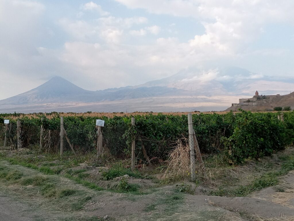 修道院の少し手前で、写真ストップ。ブドウ畑のそばで、修道院とアララト山をセットで望むことができます。この時は、小アララト山は頂上まではっきり見え、大アララト山は中腹辺りまで見ることができました。