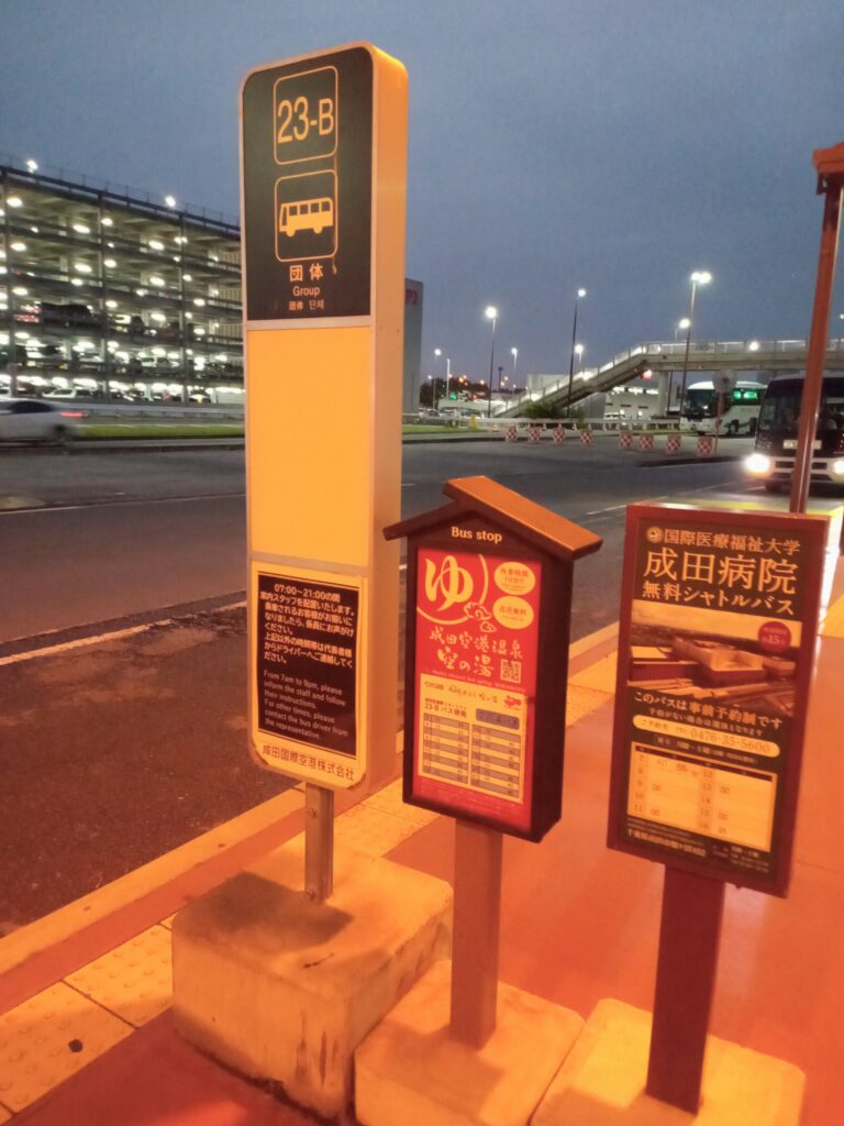 泊まるのは、成田空港温泉 空の湯。空港からシャトルバスが出ているので、シャトルバス乗り場へ移動しバスを待ちました。シャトルバスで施設までは10分ほどで着きます。