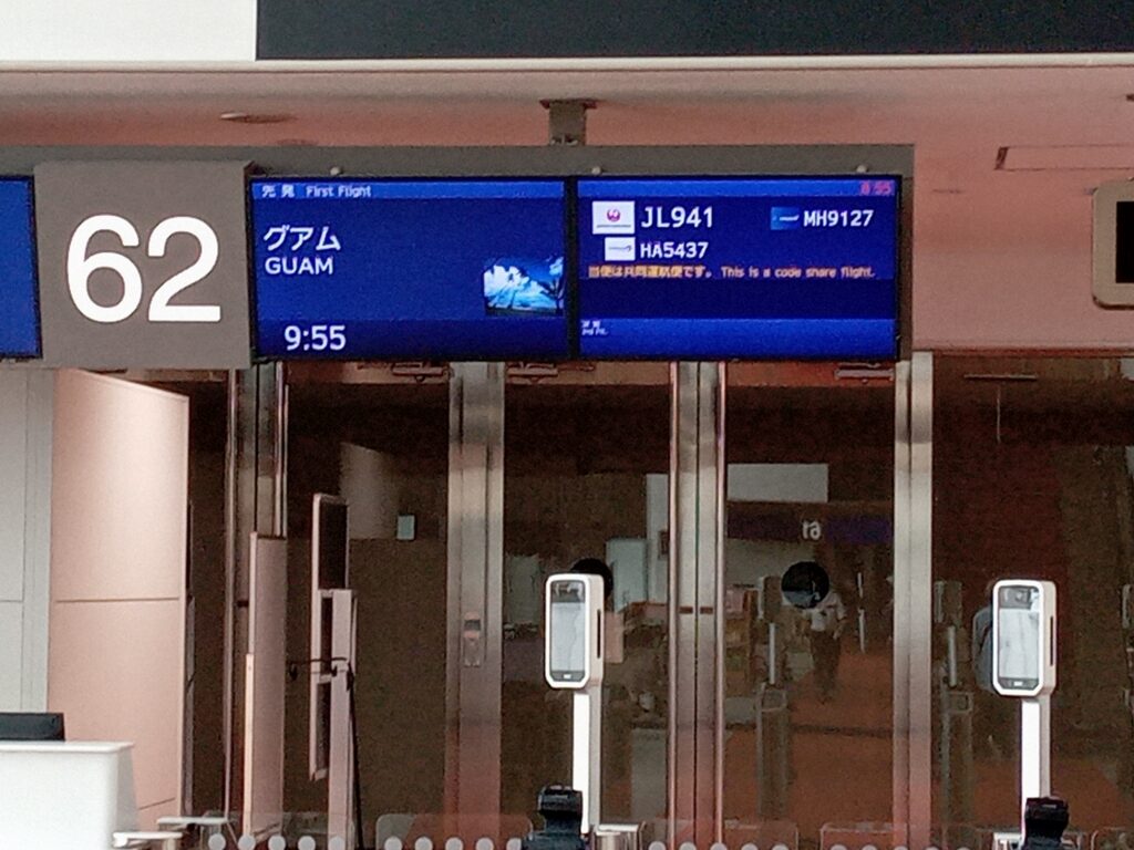 ラウンジでくつろいだ後は、諸手続きを済ませて搭乗口へ。久々にJALの飛行機に乗って移動します。グアムまでは3時間ちょっと。国際線としては短いので、あっという間という感じですね。