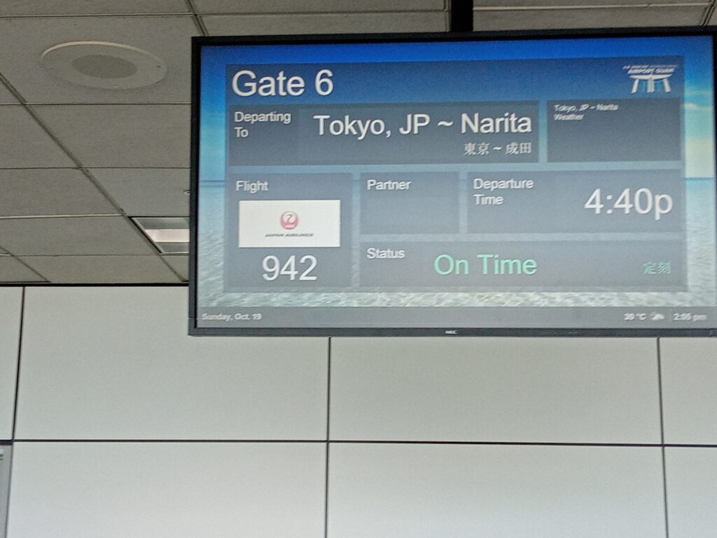 荷物を預け、保安検査を抜けたら搭乗帰国を待ちます。予定よりも少し遅れましたが、無事に成田空港を出発しました。