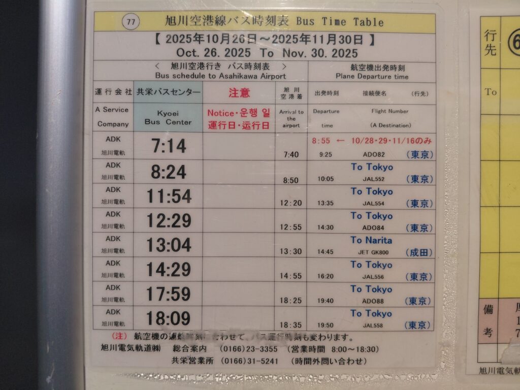 なんとこの日(11月3日)は、路線バス無料デー!!自宅近くのバス停から共栄バスセンターまで、そして、共栄バスセンターから旭川空港までの2日間、計700円のバス代が無料になりました。ラッキーです。