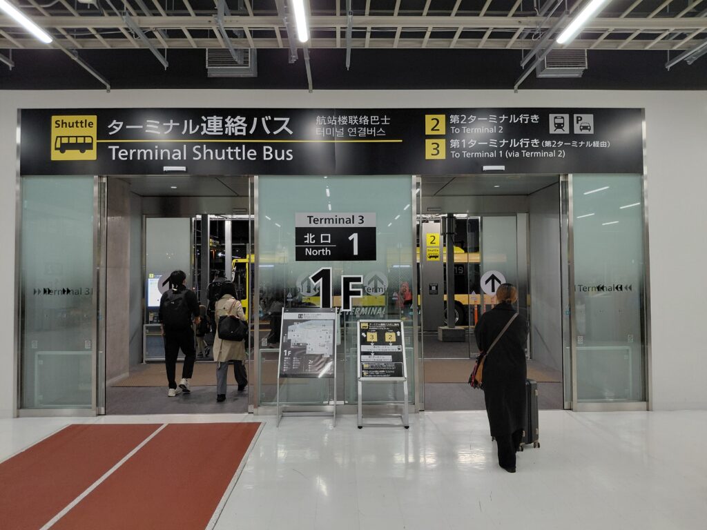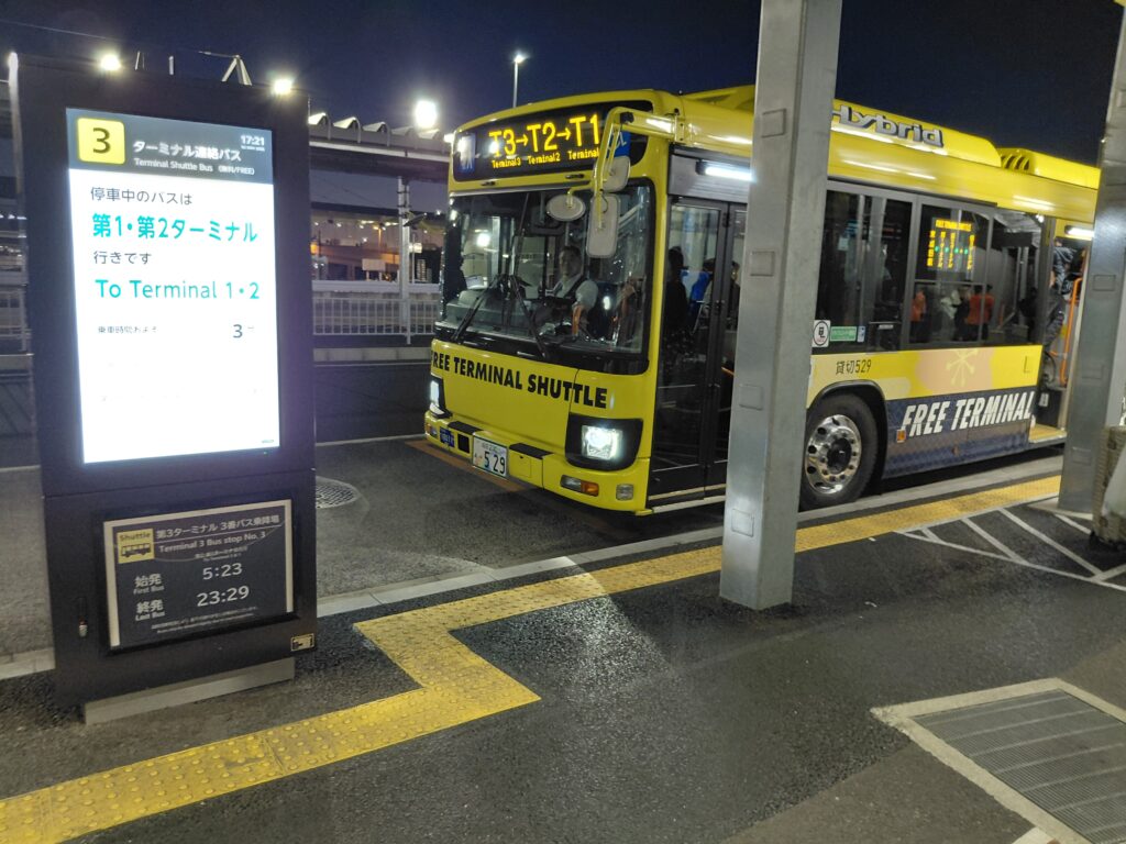 成田空港に到着したら、第3ターミナルから第2ターミナルへと移動します。徒歩でもシャトルバスでもどちらでもOKですが、ちょうどバスが来ていたので、バスで移動します。