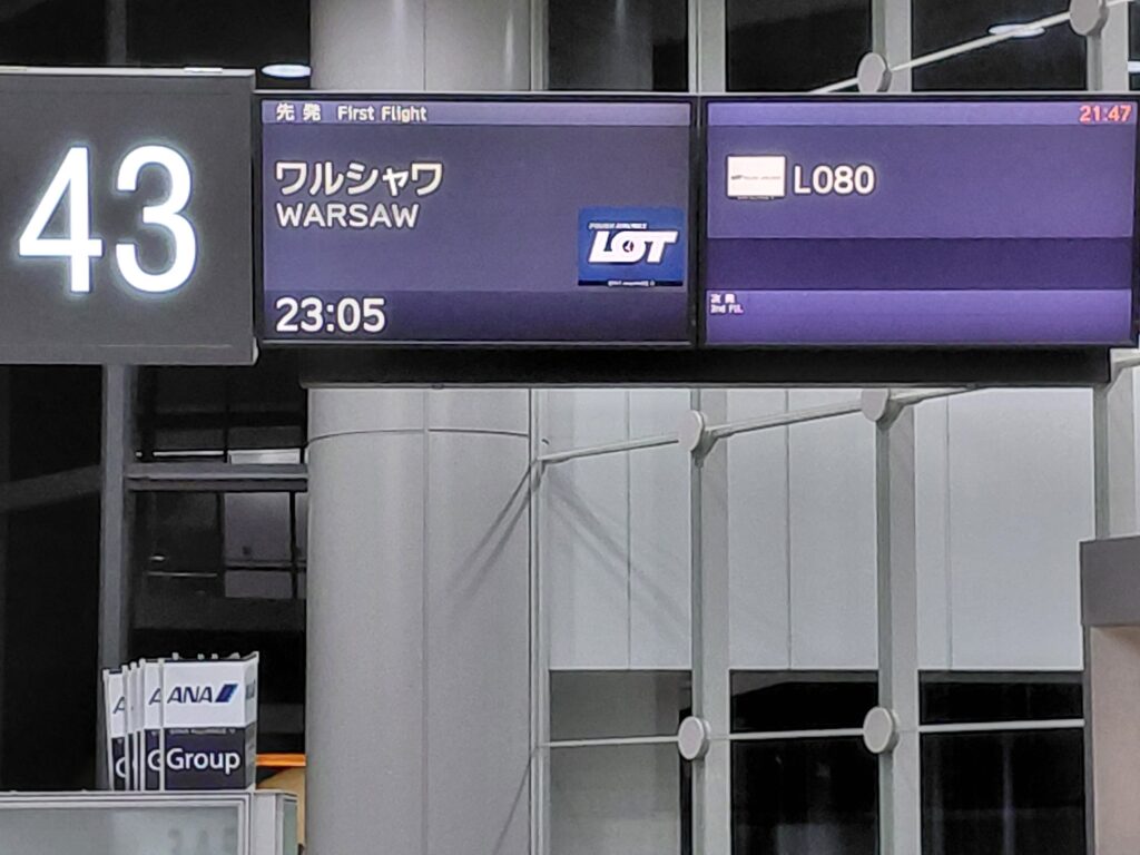 説明を受けたら、チェックイン。今回のフライトは、すべてポーランド航空です。スターアライアンス系の航空会社ということで、ゴールドメンバーの優先レーンに並び、荷物を預けます。