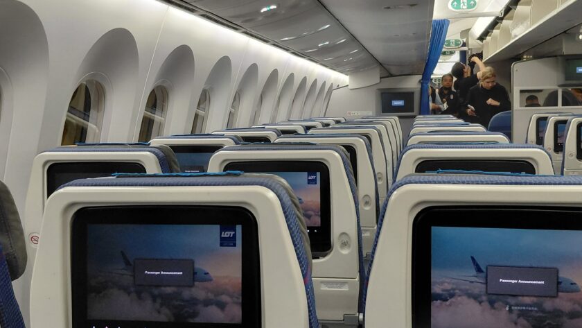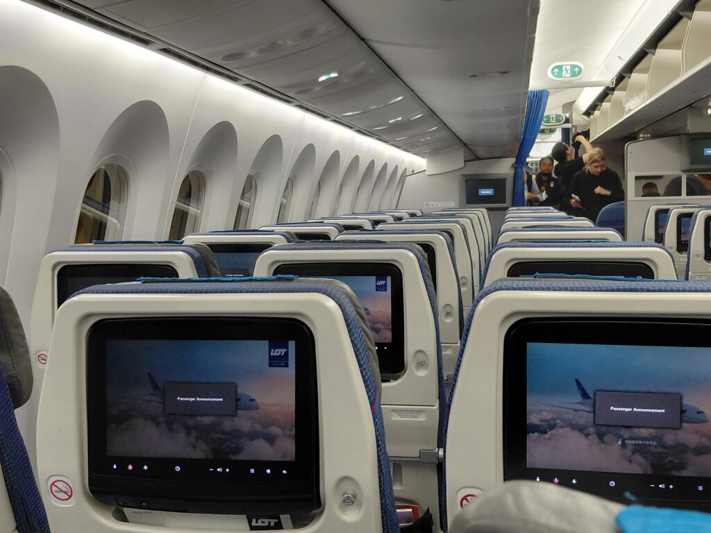ポーランドのワルシャワまでは北極海を越えて、14時間以上のフライトです。さすがに長いので、起きた後は、機内エンターテイメントの映画を見たり、ゲームをしたりして、時間を過ごしました。