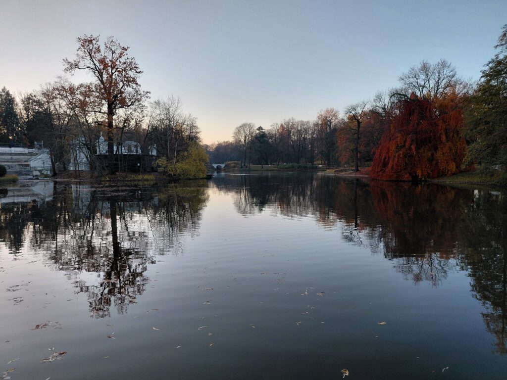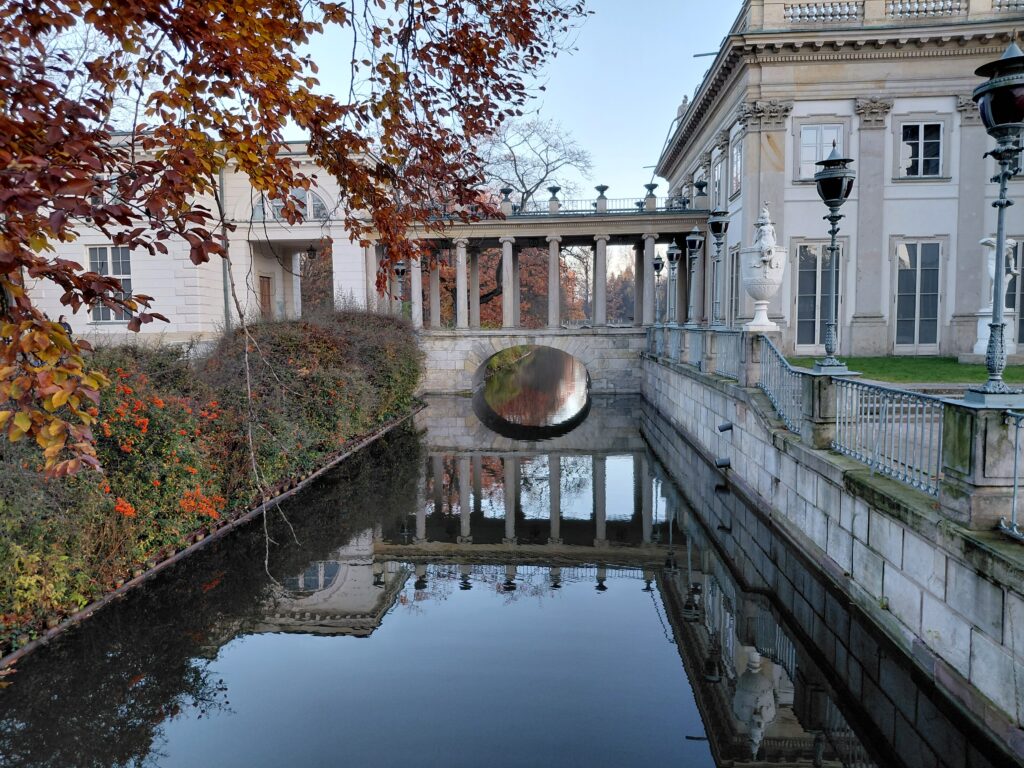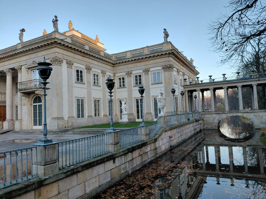 そして、公園内の池の脇に立つワジェンギ宮殿へ。別名水上宮殿とも言われています。ポーランド王の夏の離宮として建てられたものだそうです。早朝ということで、中には入れませんでしたが、公園や立派な宮殿の雰囲気を味わえただけで十分ですね。