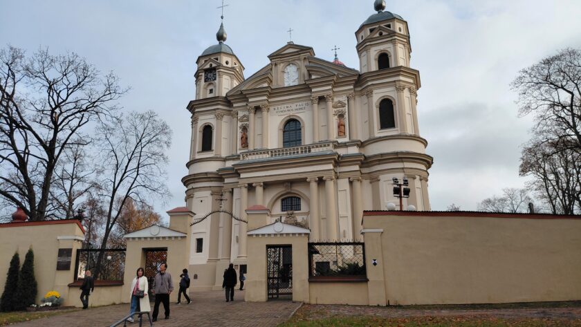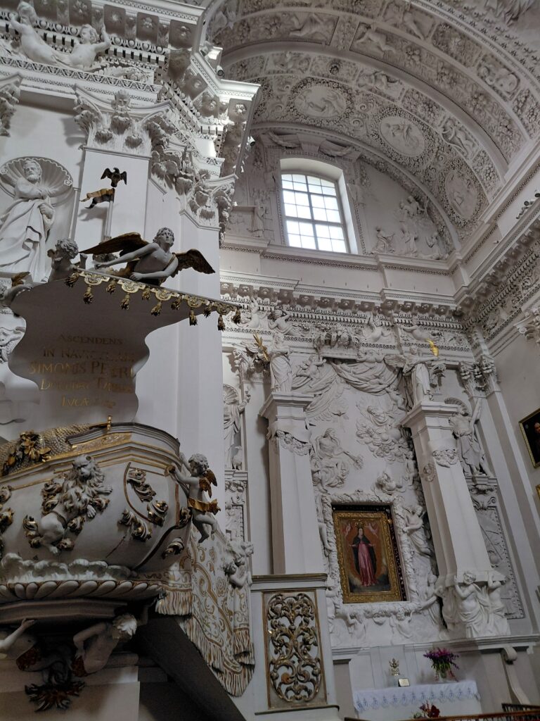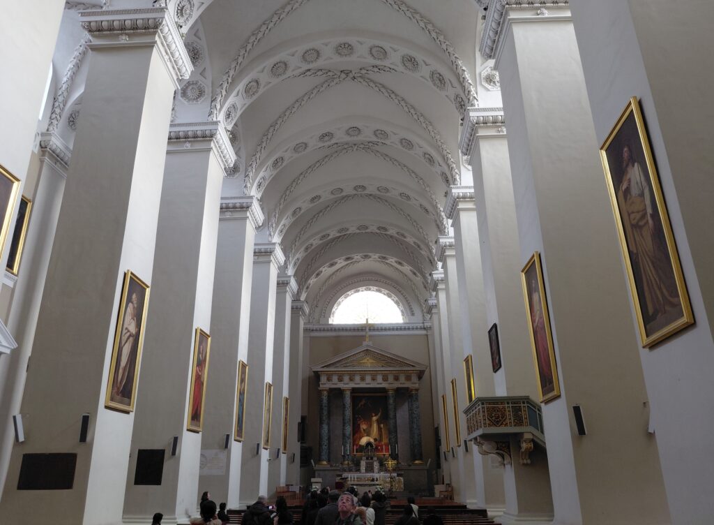 バスに乗り、市街地へと移動します。次に訪れたのは、聖ペテロ・パウロ教会。バロックの街ヴィリニュスを代表する建築物と言われています。