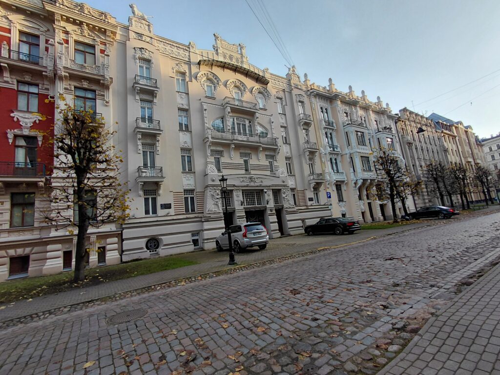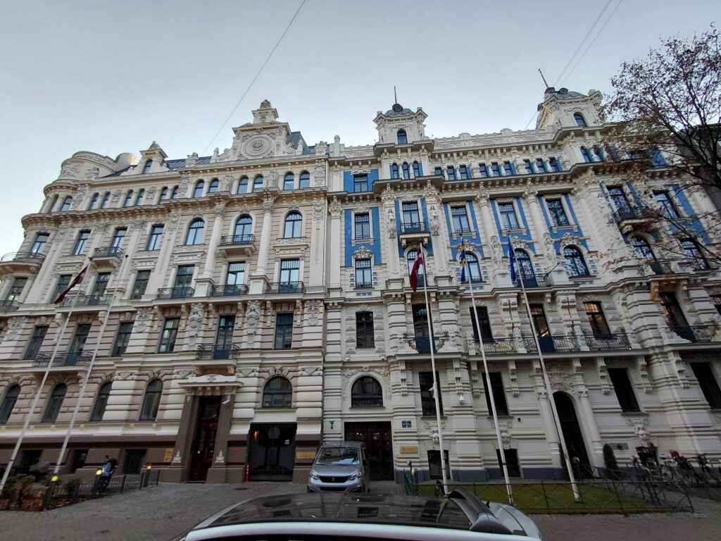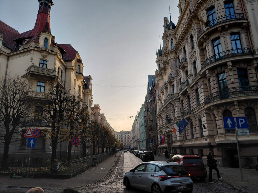 リガのホテルで朝食を取り、バスで市街地へと向かいます。ようやく明るくなってきた中、ヴァンシュ川を渡り、まずは、ユーゲントシュティール建築群を目指します。