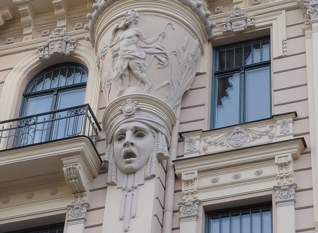 特徴は、装飾的なデザインで、曲線や植物文様を多用したものらしく、リガの市内中心部の建築の約4割は、このユーゲントシュティール様式で建てられているそうです。