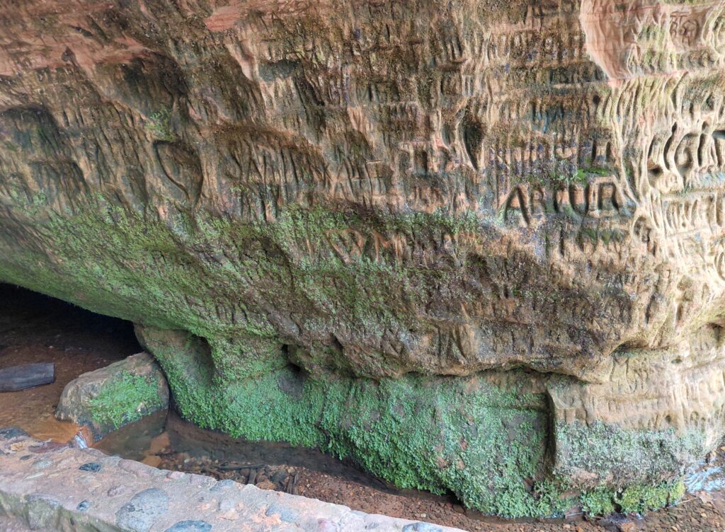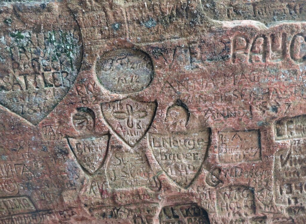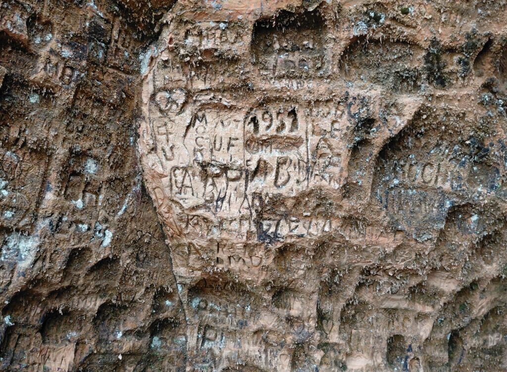穴よりも、ここには上から下までびっしりと寄せ書きがあるのが驚きです、なかには16世紀のものもあるそうです。
