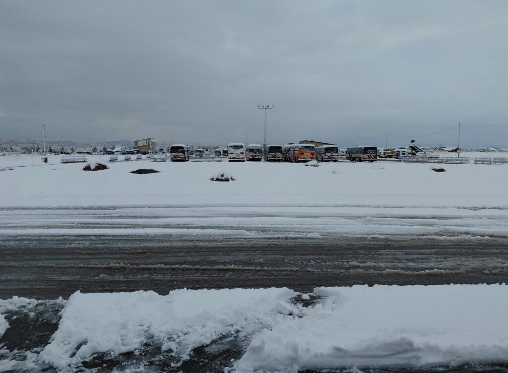 途中、高速の除雪作業車がいたことで、少し予定より遅れましたが、昼前には新千歳空港に到着です。